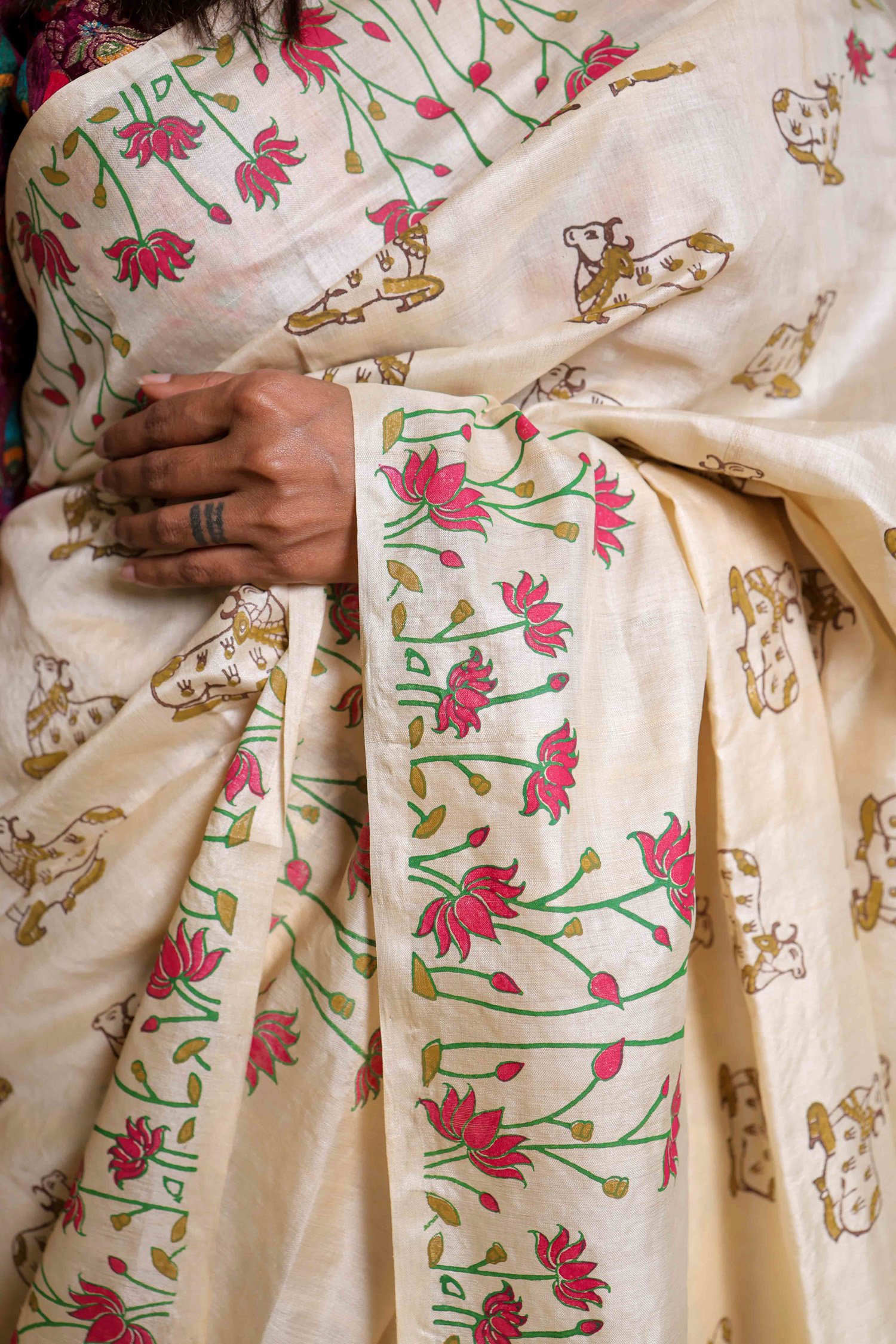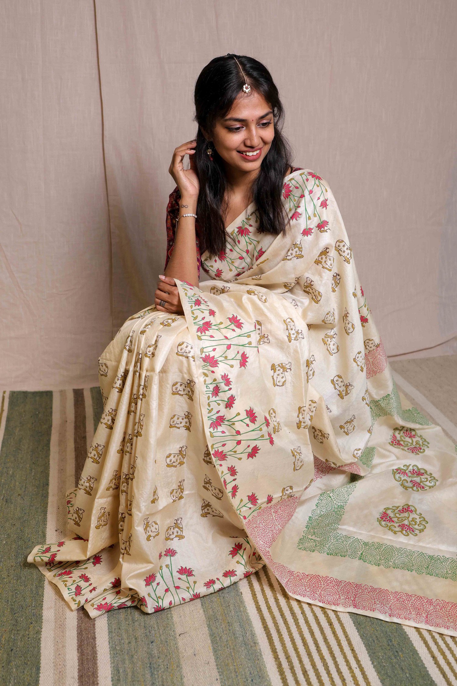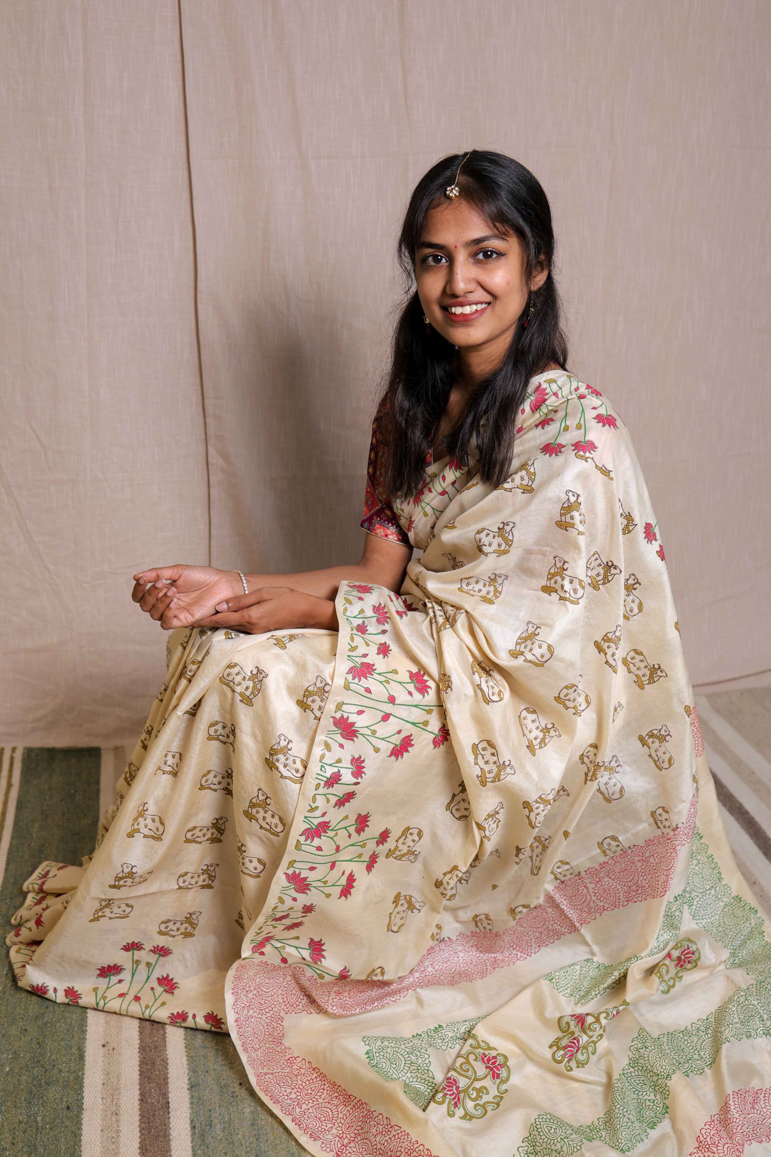 An elegant half-white Tussar silk saree brought to life with Pichwai-inspired hand-block prints. Graceful and rooted in tradition, this drape celebrates the richness of heritage art with a soft, contemporary touch